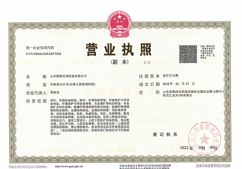 山東隆森空調設備有限公司座落于素有“九達天衢、神京門戶”美譽之稱的美麗德州,注冊資金1000萬,公司成立于2002年前身為山東明通通風空調設備加工廠。從事中央空調系統設備、通風設備、防排煙設備、玻璃鋼產品的制造、銷售、安裝及研發于一體的現代化企業。山東瀧森空調設備有限公司生產的產品主要有:排煙風機、消防排煙風機、離心風機、 新風換氣機、新風機組、凈化空調機組、醫用空調組合機組、螺桿機組、風冷機組、醫用凈化空調機組、吊頂式機組、轉輪式新風換氣機機組、風機盤管、排煙風機箱、混流風機、排煙防火閥......
